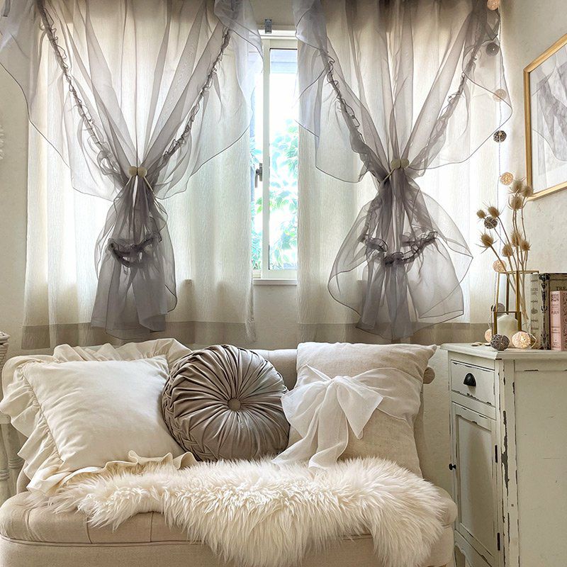 透明感の高い裾フリル付きのオーガンジーレースとラメ糸を使った非遮光の厚地カーテンを一緒に縫製した一体型カーテンです。