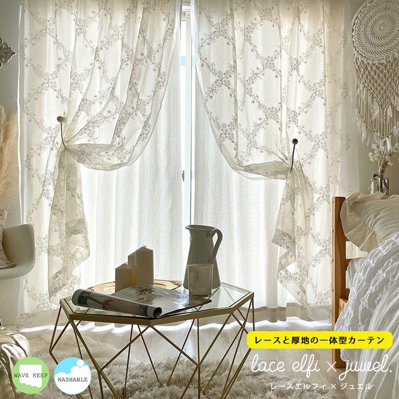 <レースエルフィ>と厚地<ジュエル>を上部で一体縫製にした手の込んだ縫製スタイルのカーテンです。透明感の高いレースを手前にしたフロントレースの一体型カーテンです。