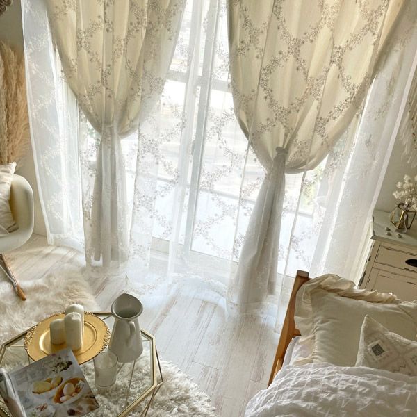 繊細な刺繍を施したオーガンジーレースとラメ糸を使った非遮光の厚地カーテンを一緒に縫製した一体型カーテンです。