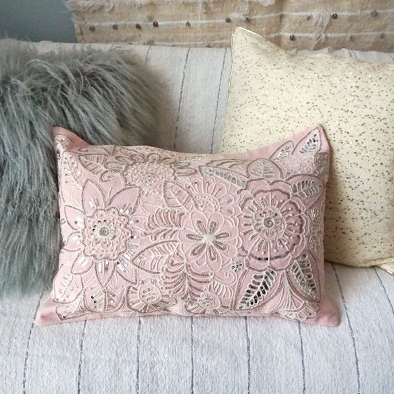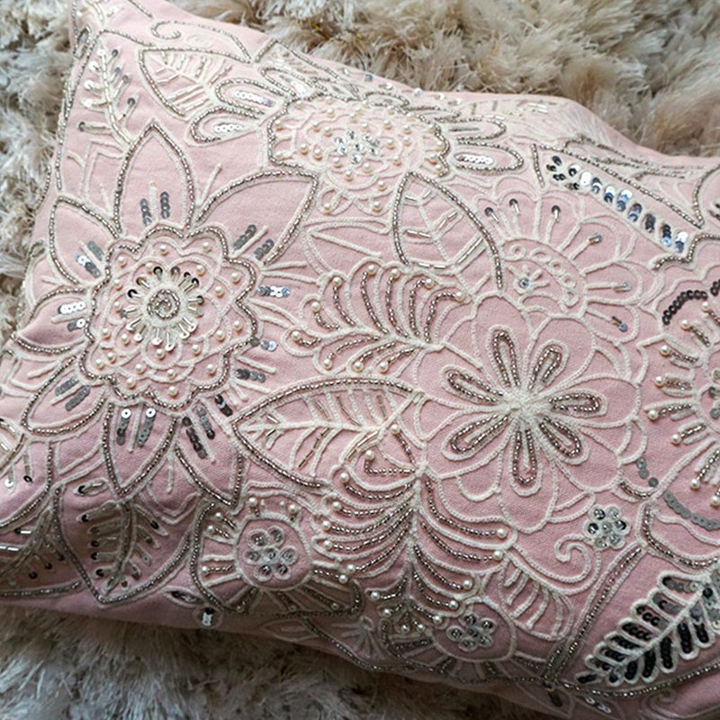 キラキラビーズが散りばめられた花柄デザインがフェミニンなクッションカバー。
