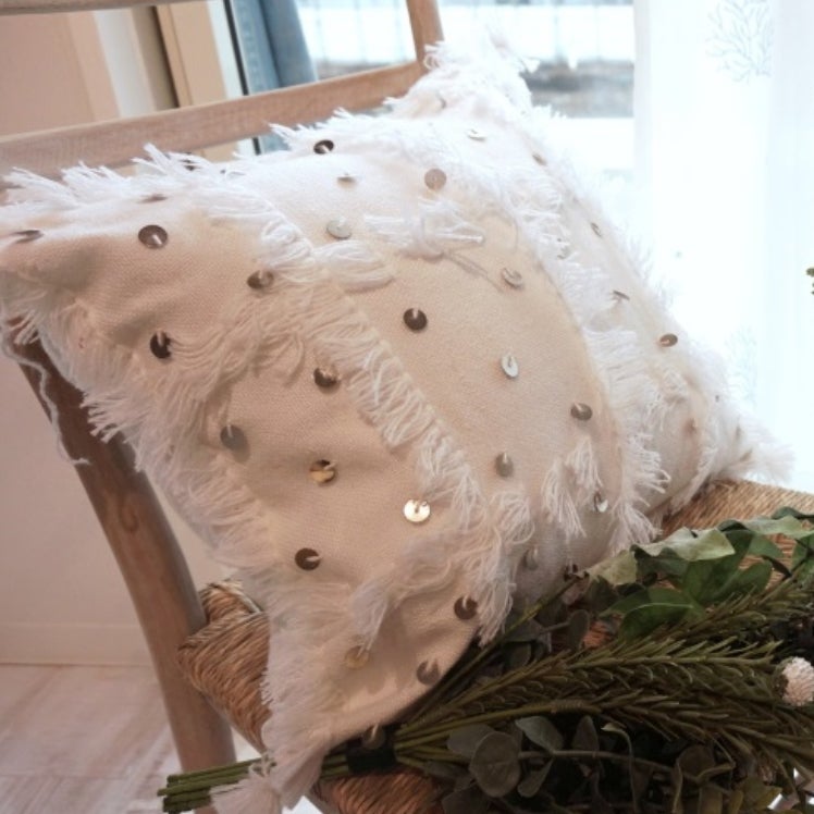 モロッコの花嫁衣装に使われるハンディラの生地を使って作られたスパンコール付きのクッションカバー。