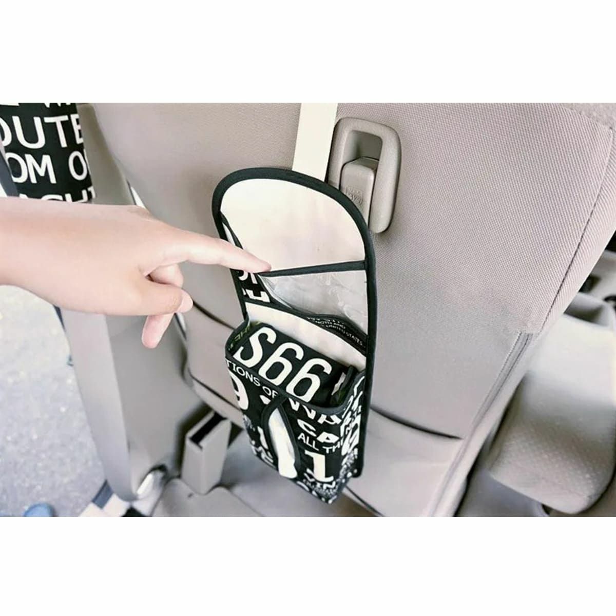 コードとフックを使ってヘッドレストやシートなどに引っかけアジャスターで固定し使用します。