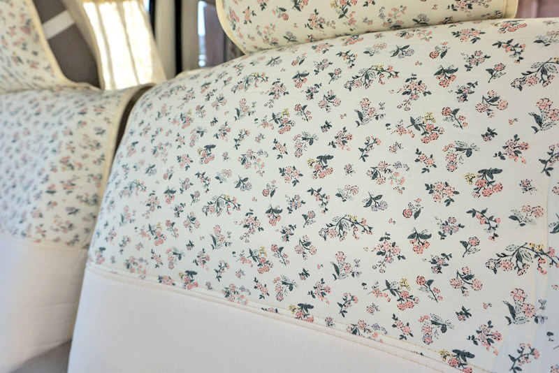 リネンを使用した無地部分にアンティークな花柄を組み合わせたデザインです。