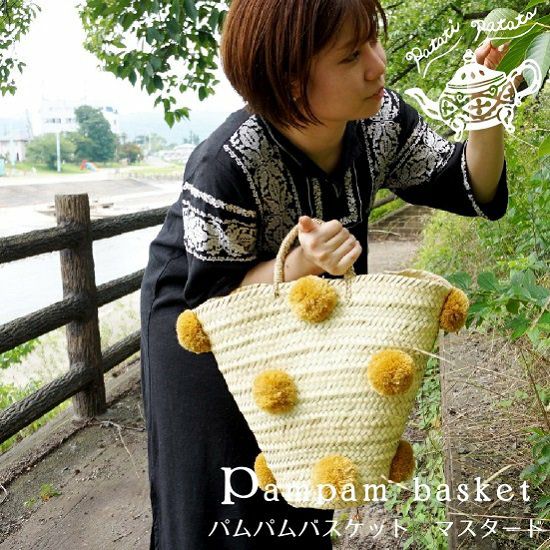 4. 【patati patata】 モロッコから直輸入したボンボンが可愛い手作りの干し草かごバッグ <パムパムバスケット マスタード>(2サイズ)
