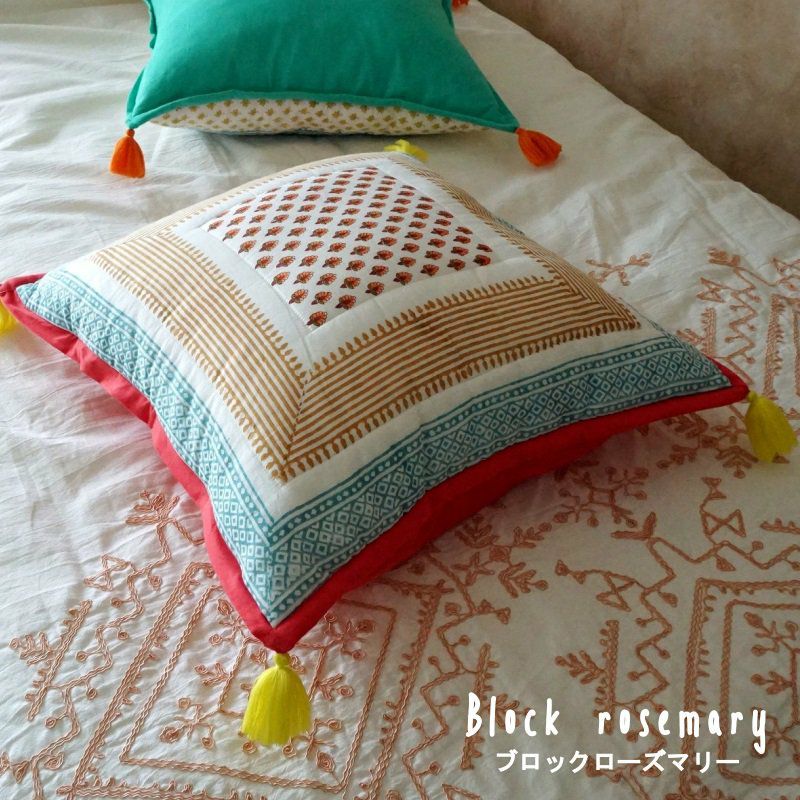 4. カラフルなブロックプリントがかわいいクッションカバー<block rosemary ブロックローズマリー>45x45cm ファスナー付き