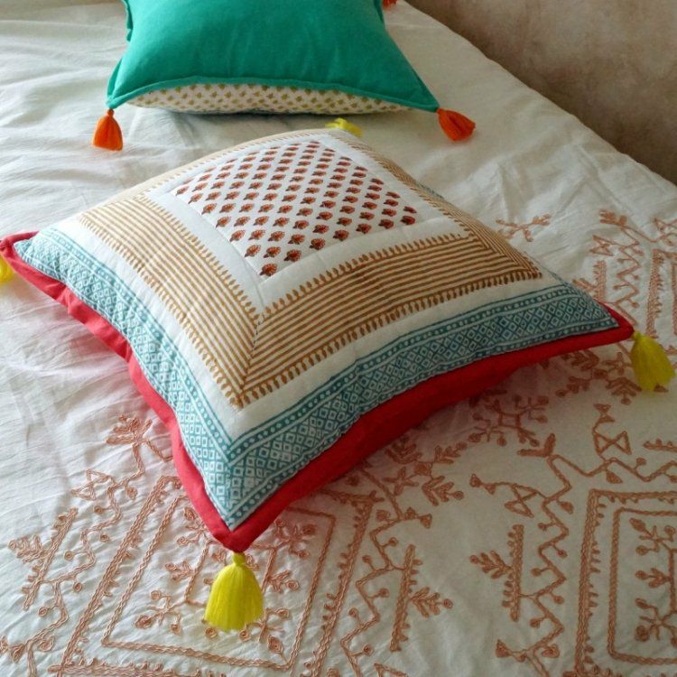 ハンドブロックプリントで丁寧にデザインされた、ラグモアだけのオリジナルクッションカバー!