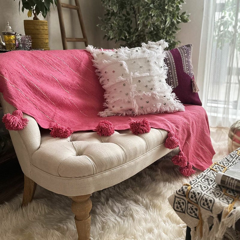 一つ一つ丁寧に手機織りされたブランケットに、ボンボンがあしらわれています。