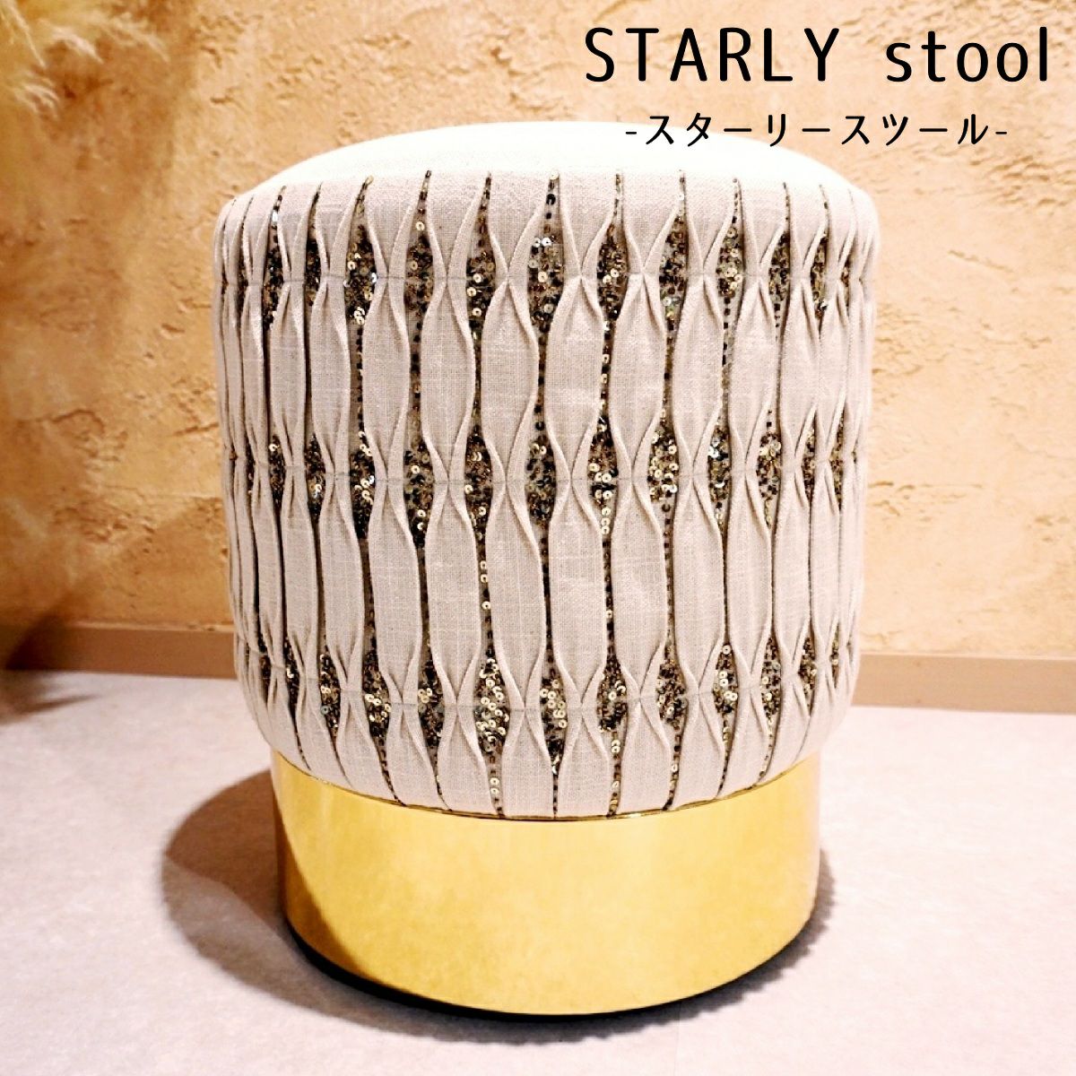 他の画像を見る 【NEW!】DRAMATICA ゴールドの台座ときらめくスパンコールがおしゃれなスツール<STARLY STOOL(スターリースツール)> 販売価格 ¥ 14,410 税込 【DRAMATICA】ドレッサーや食卓の補助いすとしてもお使いいただけるスツール カートに入れる お気に入りに登録する