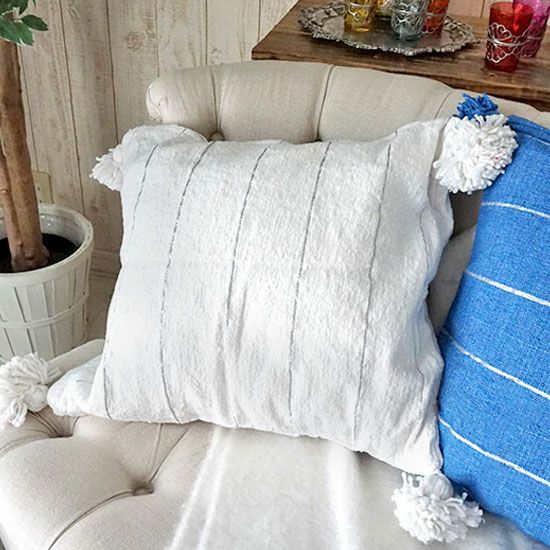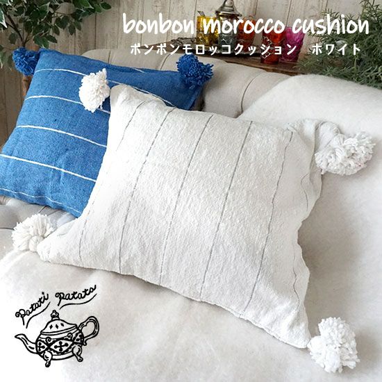 スタッフがモロッコ現地で仕入れたボンボン付きの可愛いクッションカバー。