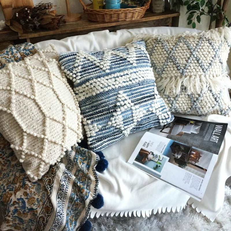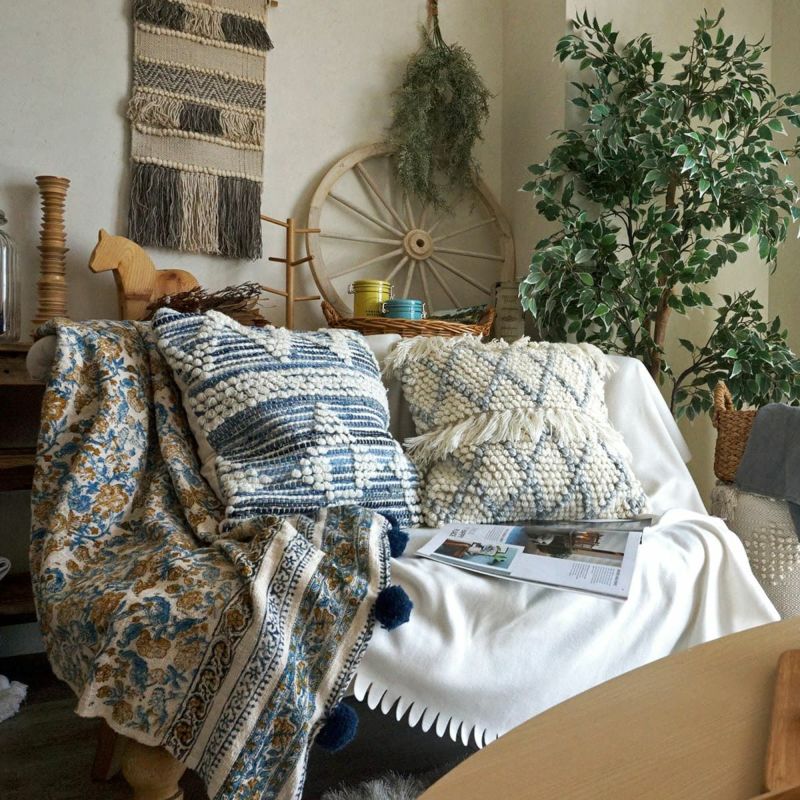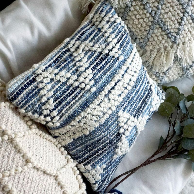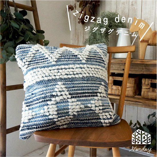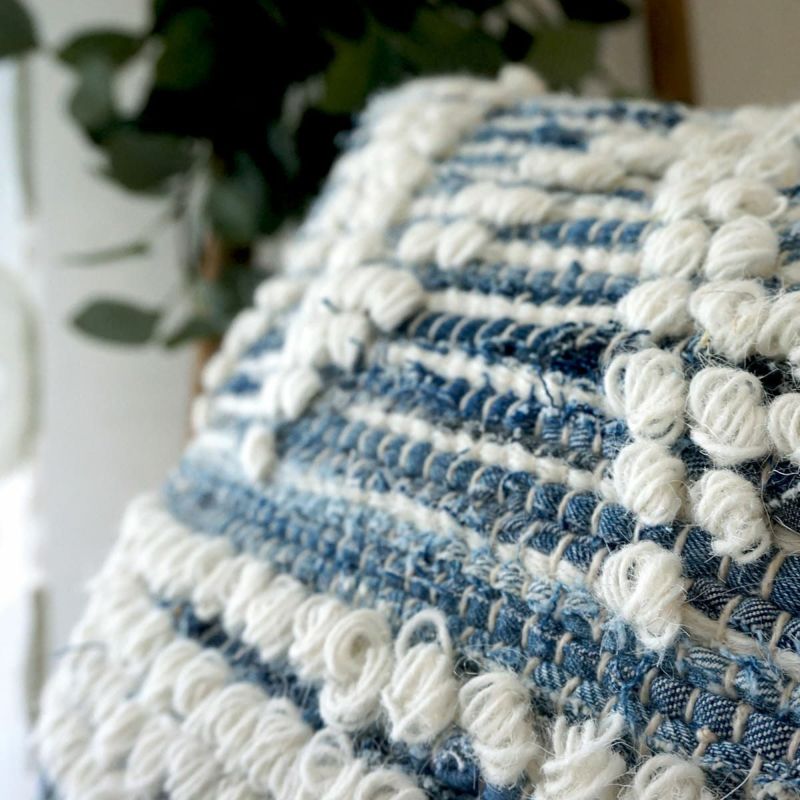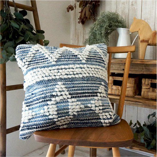 デニム生地を編み込んだ天然素材100%(コットン/ウール)の手織りのクッションカバー。ポコポコした幾何学模様が可愛くてナチュラル!
