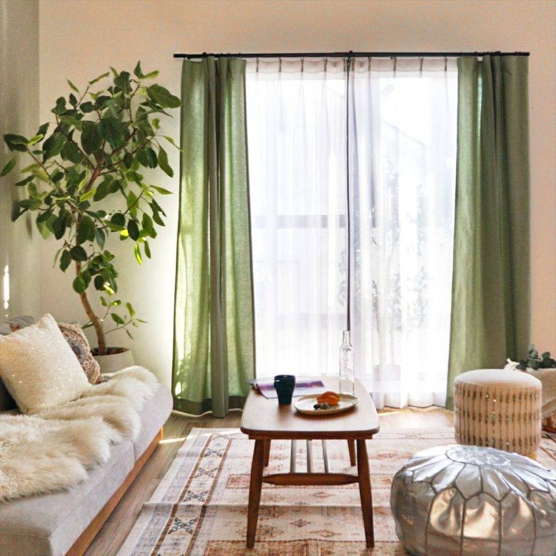 バイアステープでぐるっと囲うことでカーテンの裾と左右の折り返しをなくし、