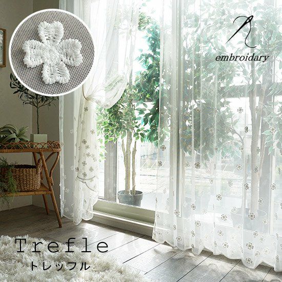 キラっとした糸をクローバーモチーフの刺繍と、スカラップ部分に使用していますので美しい窓辺を演出してくれます。