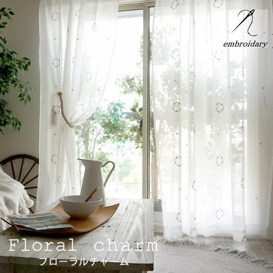 サークル状のリボンと小さなお花モチーフの刺繡レースカーテン。