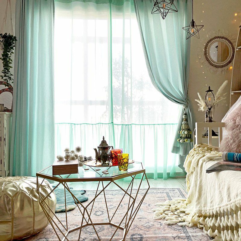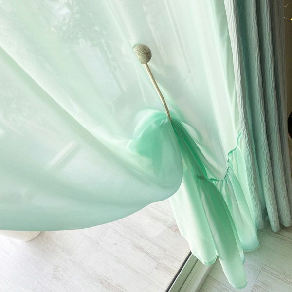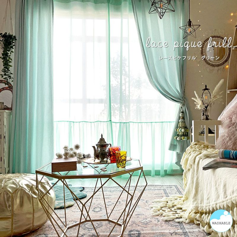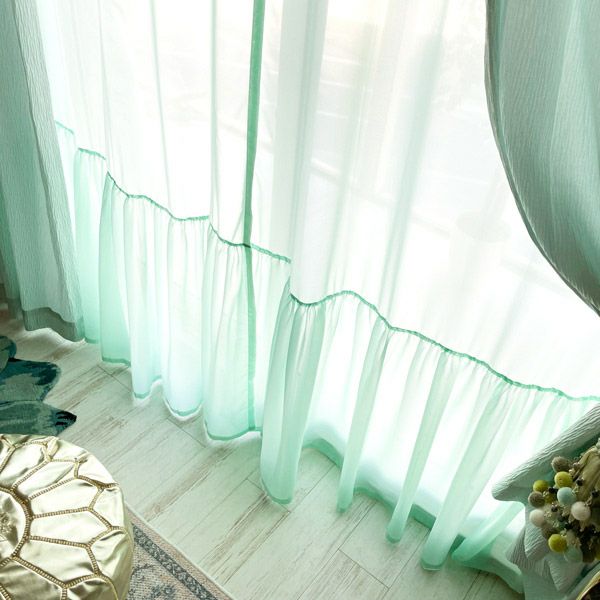 きれいなカラーのボイル生地にギャザーフリルの切り替えしを施したレースカーテンです。
