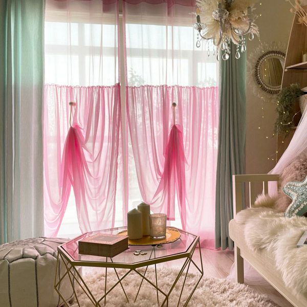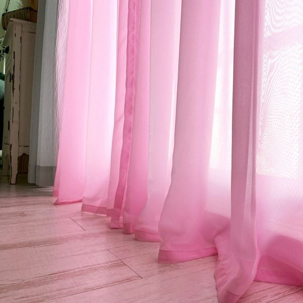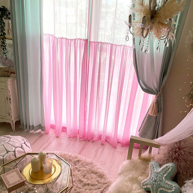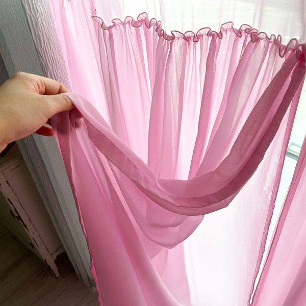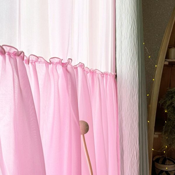 きれいなカラーのボイルレースにギャザーを寄せた生地を上から2重に縫製したレースカーテンです。