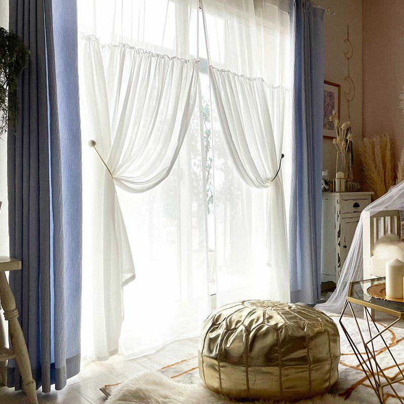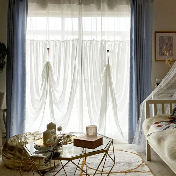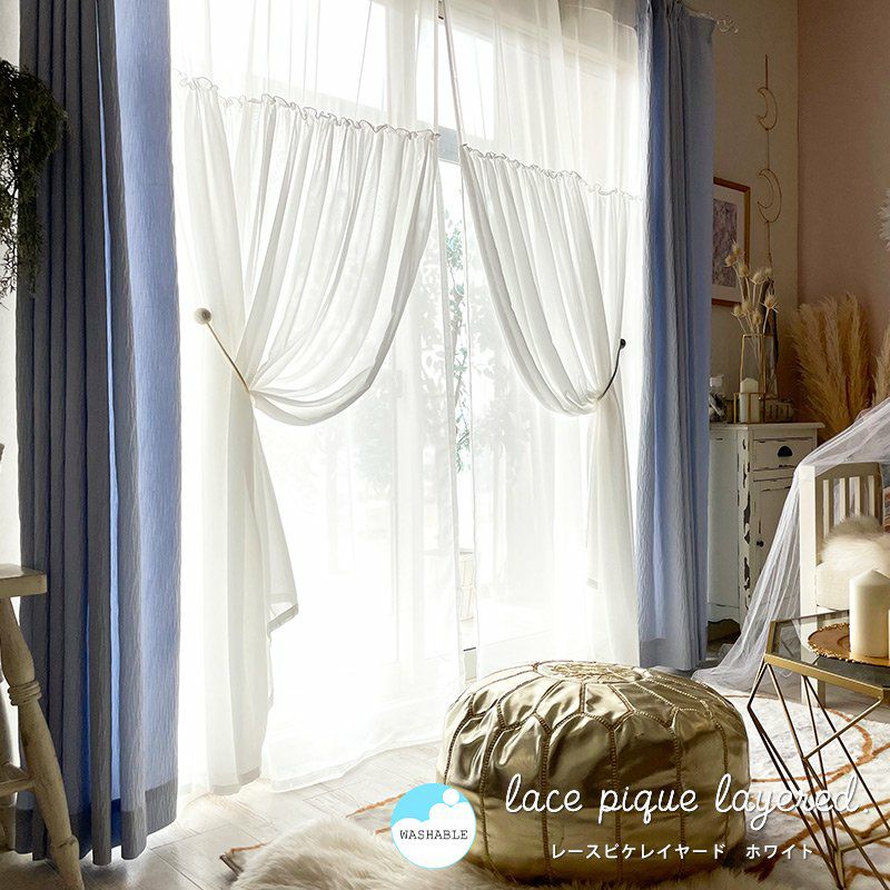 きれいなカラーのボイルレースにギャザーを寄せた生地を上から2重に縫製したレースカーテンです。
