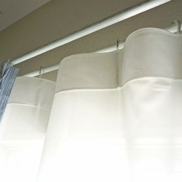 レースカーテンの途中部分からギャザーを寄せた生地を縫い付け、ギャザー以下はレースが2重になった仕様です。縫製や生地の特性上、カーテンの丈は一直線に揃わず波打ちますので予めご了承くださいませ。とろりとした生地感とルーズな雰囲気が魅力の商品です。
