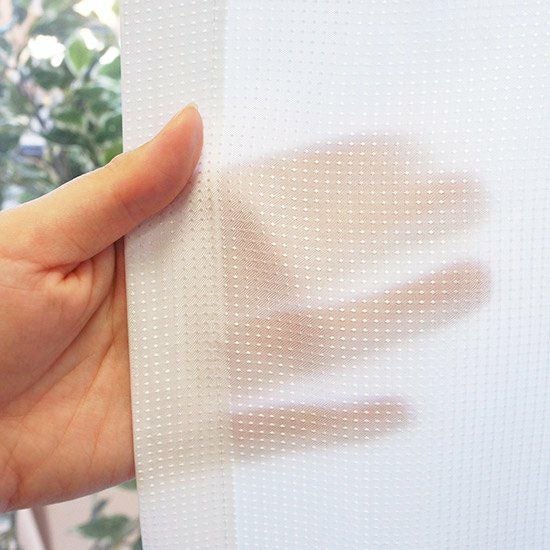 また、こちらの商品は帝人の開発した特殊繊維<ウェーブロンプラス>を使用し、これまで両立の難しかった「採光性」と「遮像性」を両立したレースカーテンです。