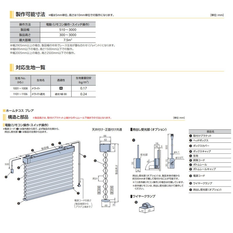 製作可能サイズ※:幅51~300cm、丈(高さ)30~300cm、最大面積:メライト/7.5平米 メライト遮光/6平米
