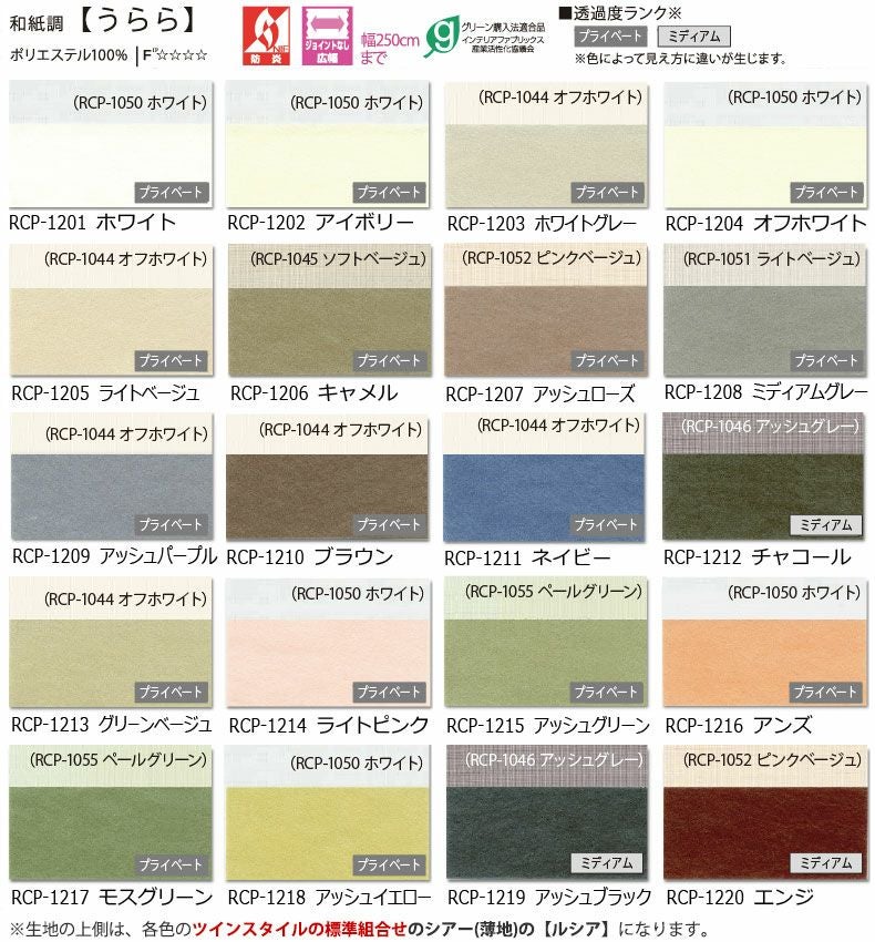 和紙調の生地で透け感を抑えた【うらら】と薄地(シアー生地)の【ルーシア】は広幅にも対応。