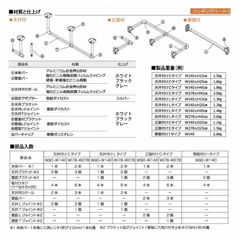 また、ハンギングバーはアルミ製のため、本体バー、天井吊りポール、壁面バーは金ノコギリなどをお使いいただきますと、カット加工が可能です。