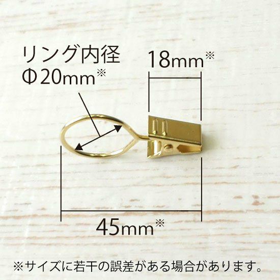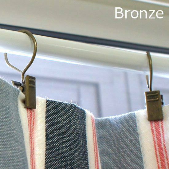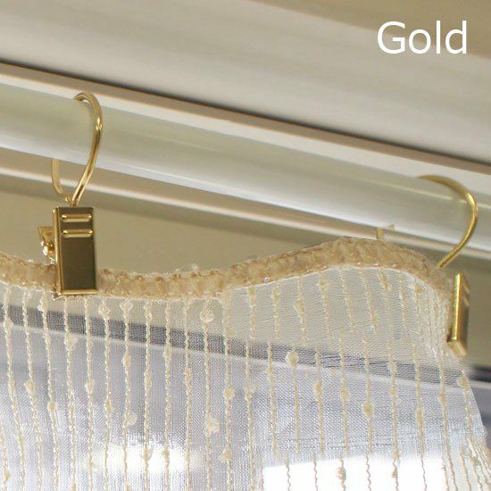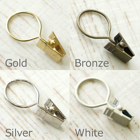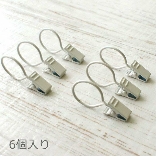 カーテンやお好みの布地を挟んでポールに通すだけの簡単取り付け。 あなただけのオリジナルカーテンの出来上がり! 10cm間隔に1個程度のご使用がオススメです。(1mにつき約 8~10個) 【商品情報】 サイズ:W約23mm×H約45mm (リング内径/20mm、クリップ部分/幅9mm×高さ18mm×奥行き11mm) カラー:ホワイト、シルバー、ゴールド、ブロンズ 素材:スチール 適応サイズ:直径2cm以下のポール 入数:6個 ※カーテンクリップ1個あたり約200gまでの重さでご使用ください。 ※サイズ誤差やフックの形が均一ではない場合がございます。予めご了承ください。