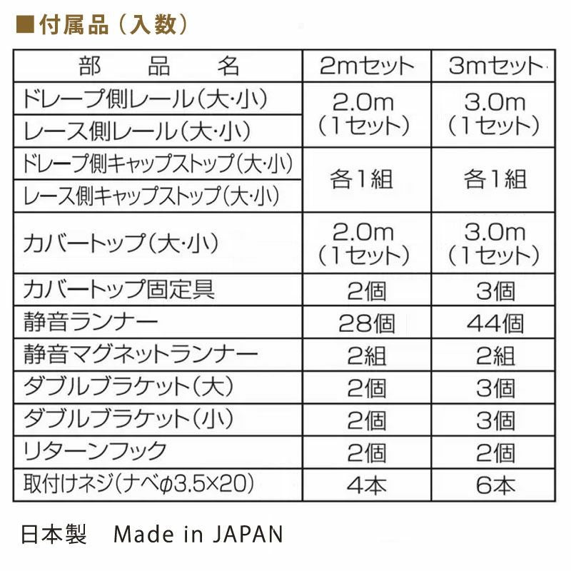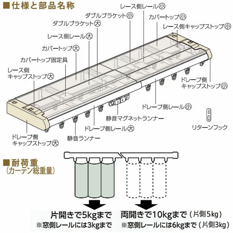 両開きカーテンの場合:10kg(片側5kg)まで ※レース側(窓側)レールには6kg(片側3kg)まで