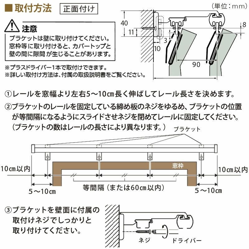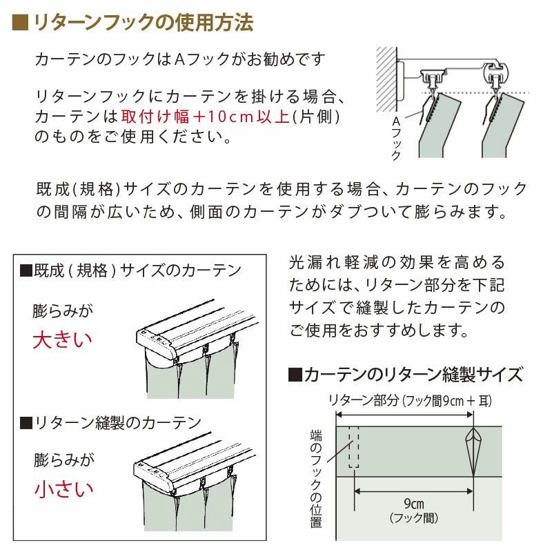 リターンフックにカーテンを掛ける場合は、カーテンは取り付け幅+10cm以上(片側)のものをご使用ください。