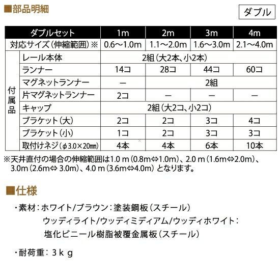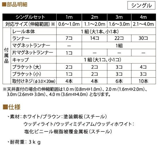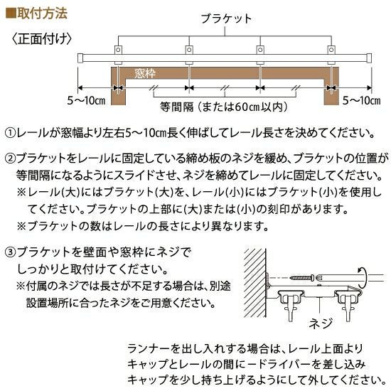 サイズ調整が自由な伸縮性カーテンレールです。お引越しでお窓のサイズが変わっても、調整してご利用いただけます。 走りの軽い車式ランナー採用でカーテンの開閉もスムーズ。 正面付けと天井付けの2パターンでお取付け可能!ブラケットを使わない天井付けは間仕切り用のレールとしてもおすすめです。