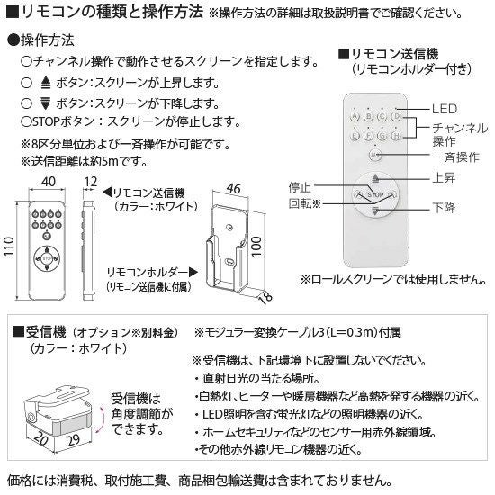 が必要です。別途ご注文ください。 ※こちらのページに掲載のリモコン送信器は赤外線専用のため、<RF(無線)仕様>には使用できませんのでご注意ください。 ※ニチベイ社製電動ロールスクリーンでは、旧タイプの【ポポラ(※2019年6月販売終了)】にもご使用いただけます。ただし、現行の【ポポラ2】は電動非対応となっておりますのでご注意ください。