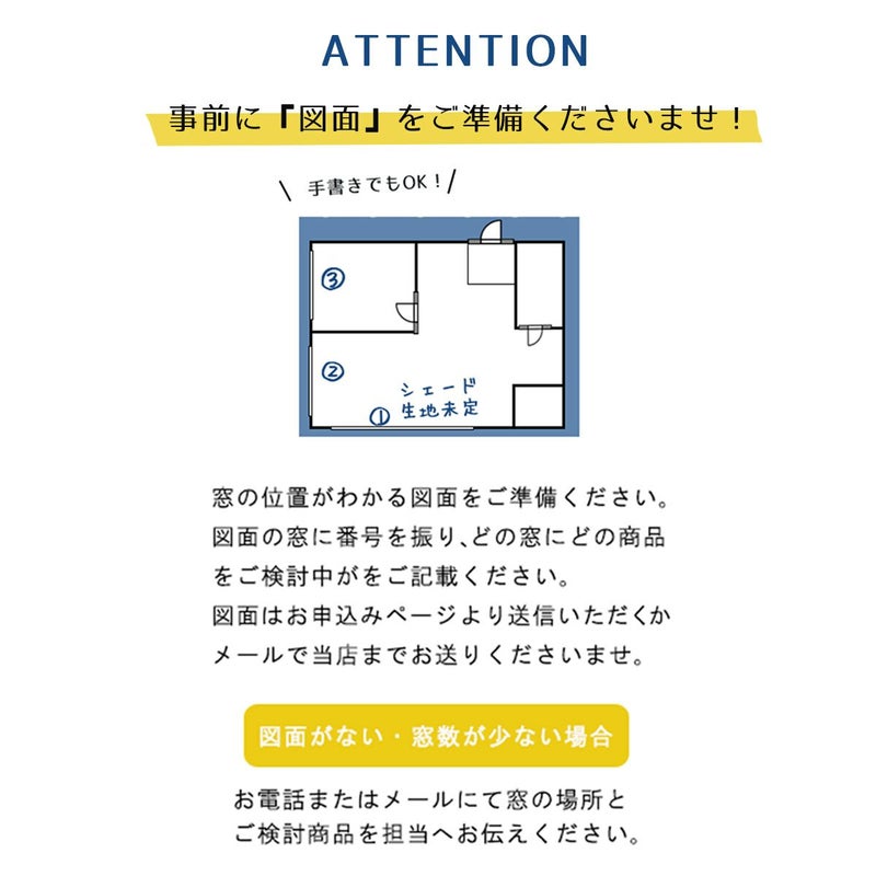 □ ご注文完了後、<curtain@bickly.net>宛にご希望商品と、採寸箇所に番号を振った図面をお送りくださいますようお願い致します。