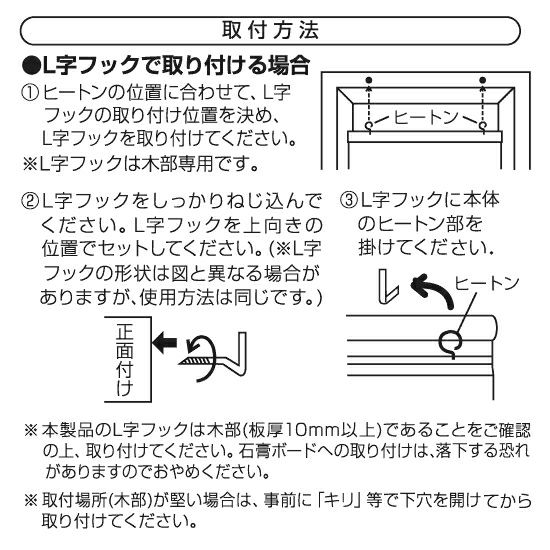 付属品:L字フック2個、ヒートン(本体に付属)2個、取り扱い説明書