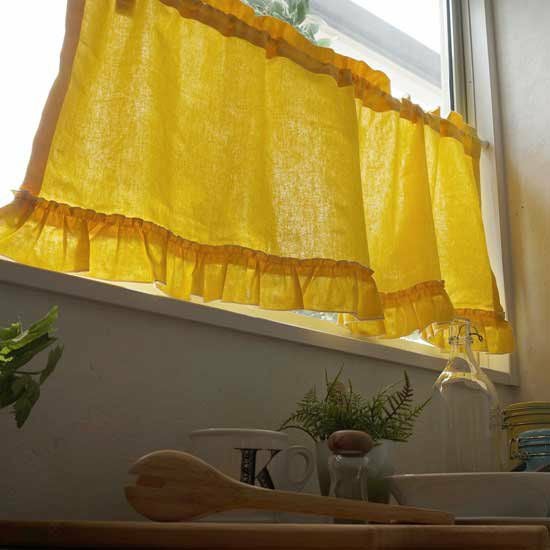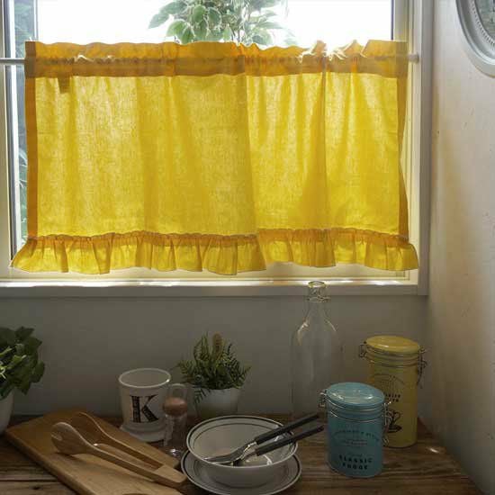 カーテンとお揃いの生地で、小窓にはカフェカーテンのスタイルはいかがでしょう。