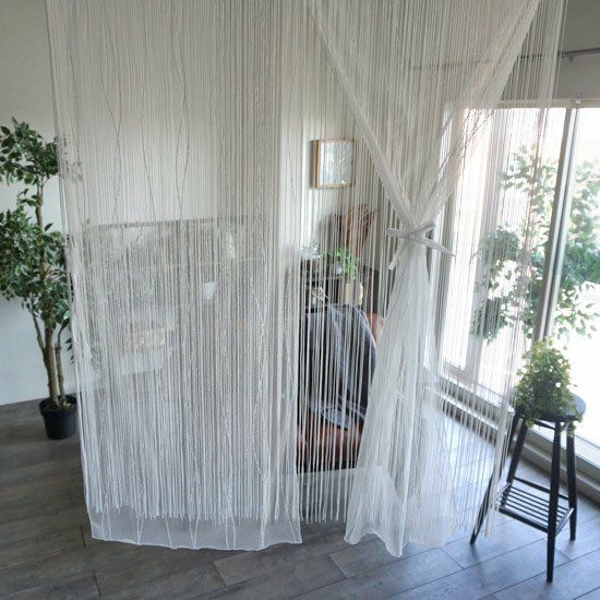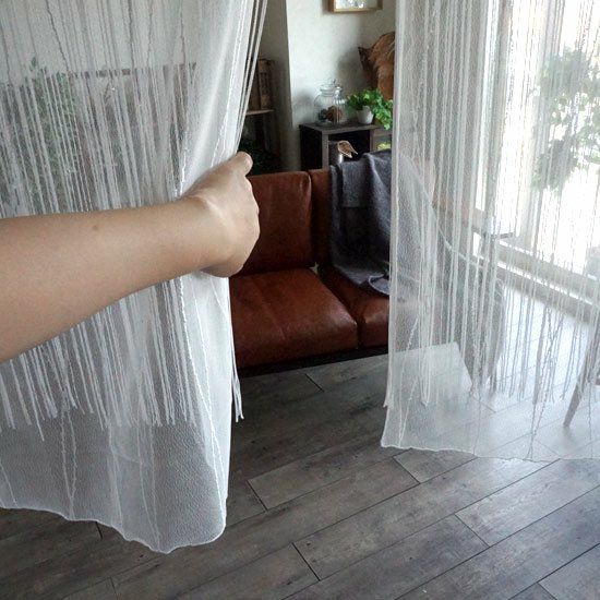 繊細で上品な風合いが出せるバリカンレースに紐のれんを重ねてアレンジ性とボリューム感をプラスさせたデザイン性の高いレース二重のれんです。