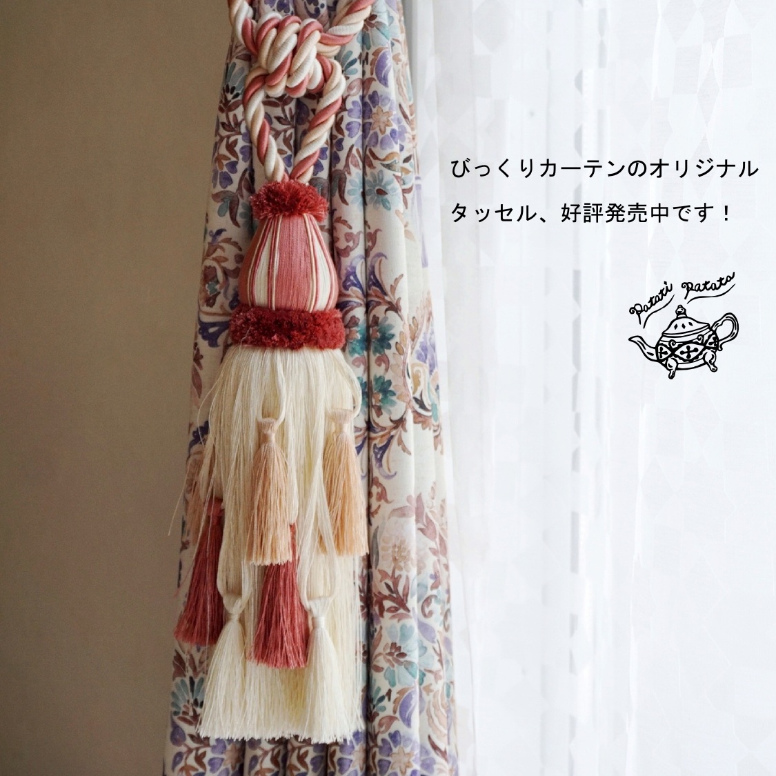 他の画像を見る 【Patati Patata】コットン100%のナチュラルでおしゃれなカーテンタッセル<フォレスト ピンク>:1本入り 販売価格 ¥ 2,310 税込 コットンをふんだんに使ったナチュラルで贅沢な一本。 カートに入れる お気に入りに登録する