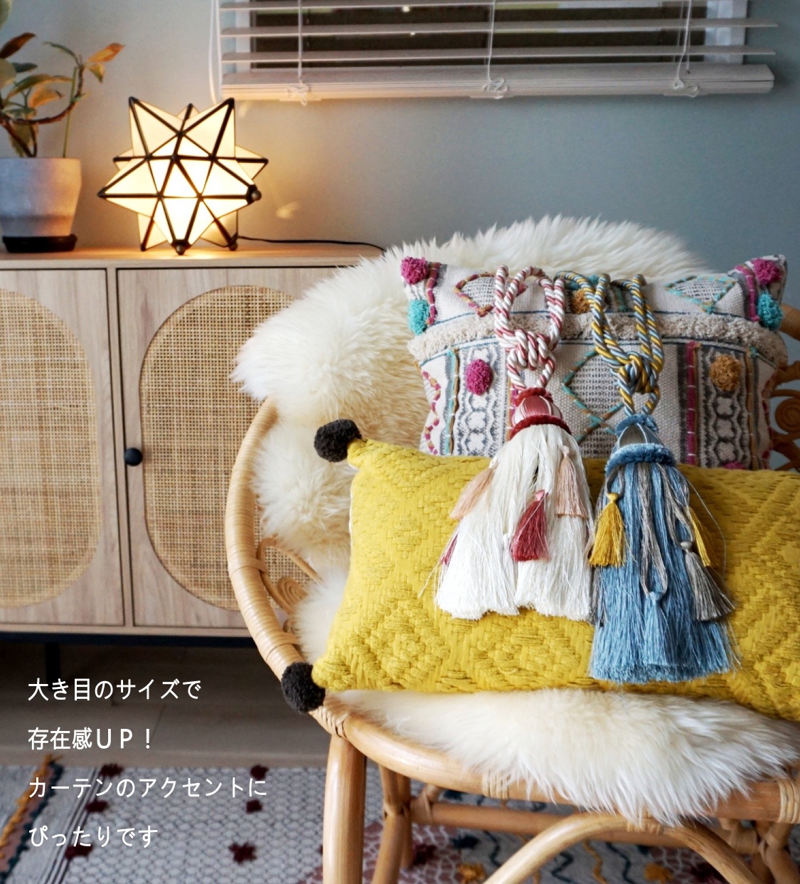 他の画像を見る 小さなタッセルが散りばめられたおしゃれなモロッカンタッセル【ベルベル ブルー】:1本入り 販売価格 ¥ 1,320 税込 カラフルなモロッカンにもナチュラルなカーテンのアクセントにもおすすめのおしゃれなタッセルです♬ カートに入れる お気に入りに登録する