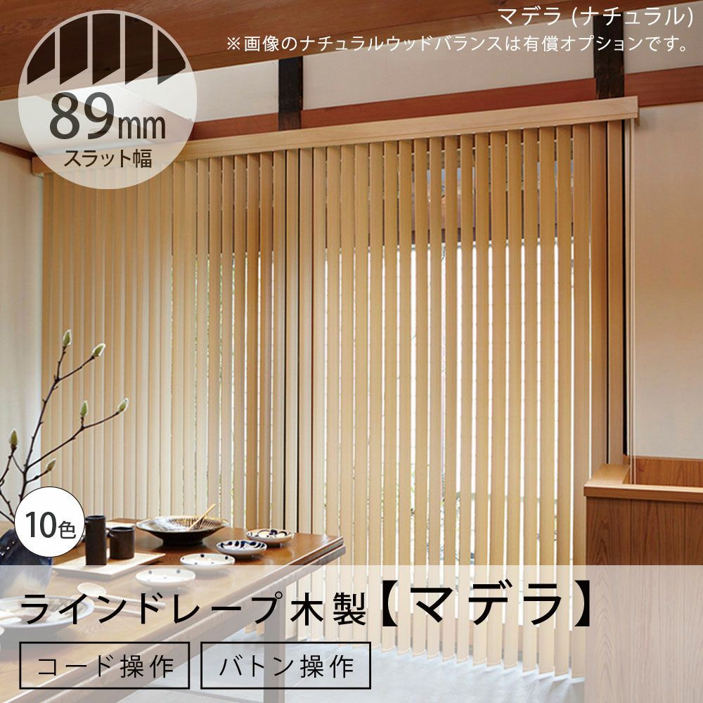 【商品詳細】 スラット幅:89mm 組 成:天然木(アバチ材) 操作方法:ツーコード操作 付属品:取付金具(ブラケット・ネジ) 必要工具:プラスドライバー 原産国:日本製 ※防炎認定対象外です。 ※サイズ指定は1cm単位です。 ※操作方法により納まり(スラットたたみ)は異なります。両側操作は左右どちらでも操作可能ですが、よく使う操作側をご指定ください。 ※取り付け高さのご指定がない場合は、丈(製品高さ)を取付け高さとして製作します。 ※丈(製品高さ)にはブラケットの厚みを含みます。★直付けは除く ※付属の取付ビス(木ネジ)はサービスビスとなります。ビスの長さが足りない場合は、別途設置場所に応じたものをご用意ください。 取付ビスについて詳しくはこちらをご参照ください。 ★【カーテンボックスに取付け】の場合、事前に取付可能な奥行きがあるかどうかをご確認ください。 詳しくは【取付け方法】をご参照ください。 取付方法や採寸・ご注文方法でご不明な点がありましたら、お電話ください!