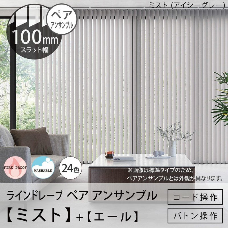日本製・パウダータッチの無地24色+レース15色から選べて1台2役 タテ型ブラインド<ラインドレープ ペア アンサンブル>【ミスト+エール】100mm幅(バトン操作・コード操作)※代引不可