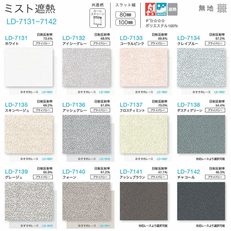 厚地の「ミスト遮熱」はパウダータッチのやわらかい質感と、上品なグレイッシュカラー12色。
