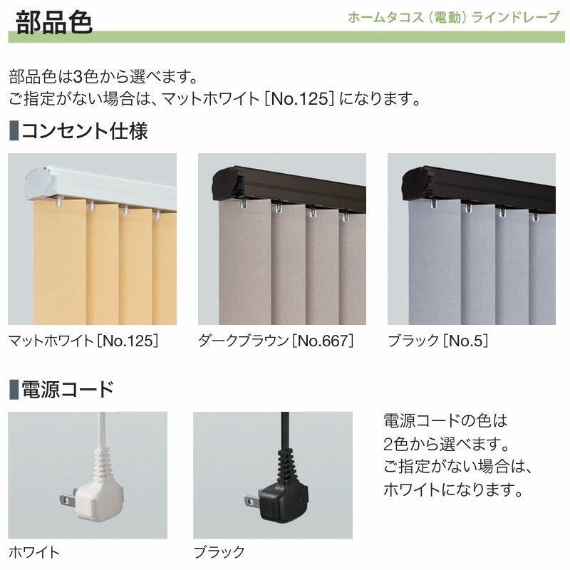 「リモコンの操作方法」・「その他機器との接続」について 「RF/赤外線リモコン」「リモコンホルダー」「持出し受光部」仕様詳細 【商品詳細】 操作方法:電動式・赤外線リモコン操作 電源仕様:コンセント仕様 納まり:片開き・両開き(両納まり) 製作可能寸法: [スラット幅80mm] 60~300cm、 [スラット幅100mm] 60~400cm 製品高さ(丈): 400~2800cm 最大面積: 12m2 ※製作可能なサイズはスラットによって異なります。「対応生地一覧」 にてご確認ください。 ※オプションの【電源分岐ジョイント】は、製品幅70cm以上に対応します。【電源分岐ジョイント】をご選択の際は、取付場所や状況をご確認の上、位置関係や「電源分岐コード長さ」を指定してください。単体や複数台接続の先頭の場合は「電源コード長さ」を指定してください。 ※「電源(分岐)コード位置」は、取付け場所をご確認の上、窓側に向かって右側または左側のどちらかをお選びください。複数台を接続する場合は、「電源(分岐)コード位置」をそろえてください。 ※製品幅が大きい場合は、エレベーターや廊下などの運搬経路をあらかじめご確認ください。 《ご注意》 こちらのページの【赤外線操作】のみに対応した電動部のご注文ページです。 ※別売りの「RFリモコン」でも赤外線操作が可能です。ただし【赤外線操作】の電動部で「RFリモコン」をご使用の場合も【赤外線操作】のみとなります。 【無線(RF)操作】をご希望の場合は、こちらの【コンセント仕様・RF操作】または【バッテリー仕様・RF操作】ページから【無線(RF)操作】対応の電動部(ホームタコス)とRFリモコンをご注文ください。