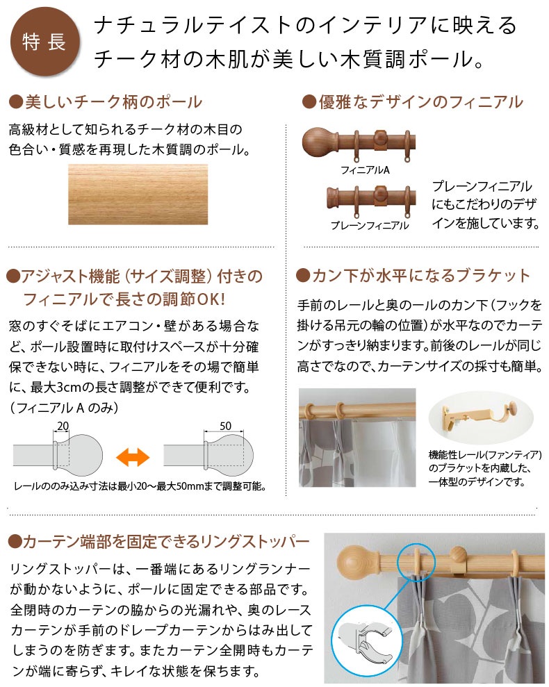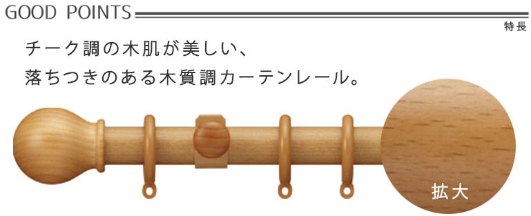 サイズオーダー可能・チークの木目を再現した木質調の装飾カーテンレール