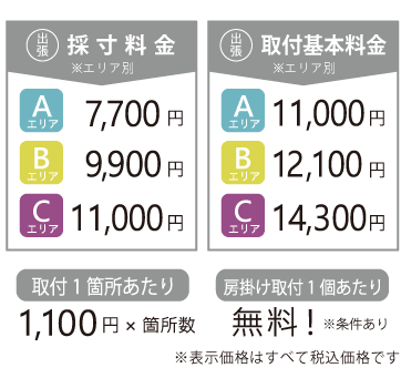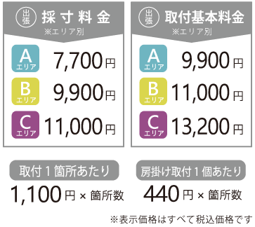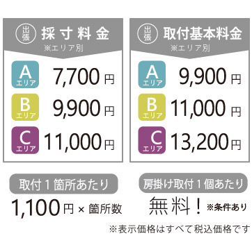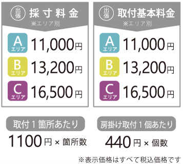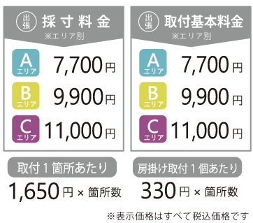 ・お客様採寸による“出張取付のみ”のご依頼は、取付基本料金に別途3,300円(税込)を頂戴いたします。