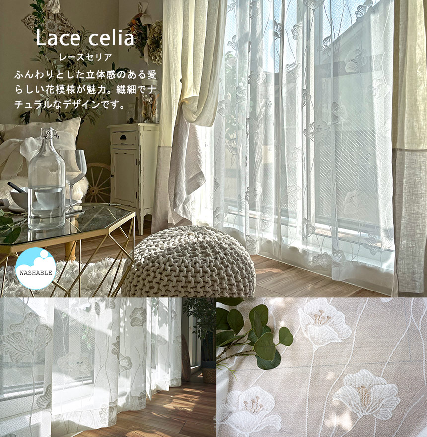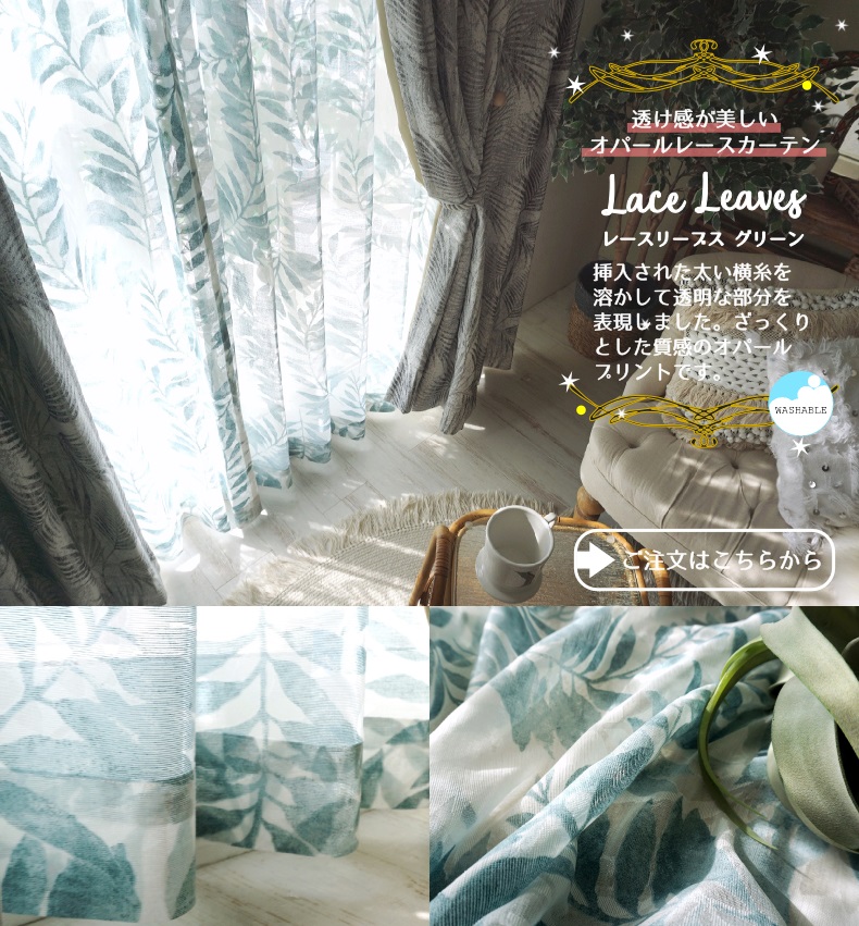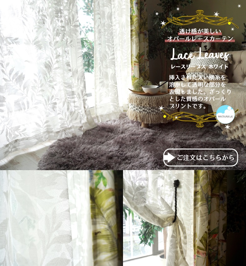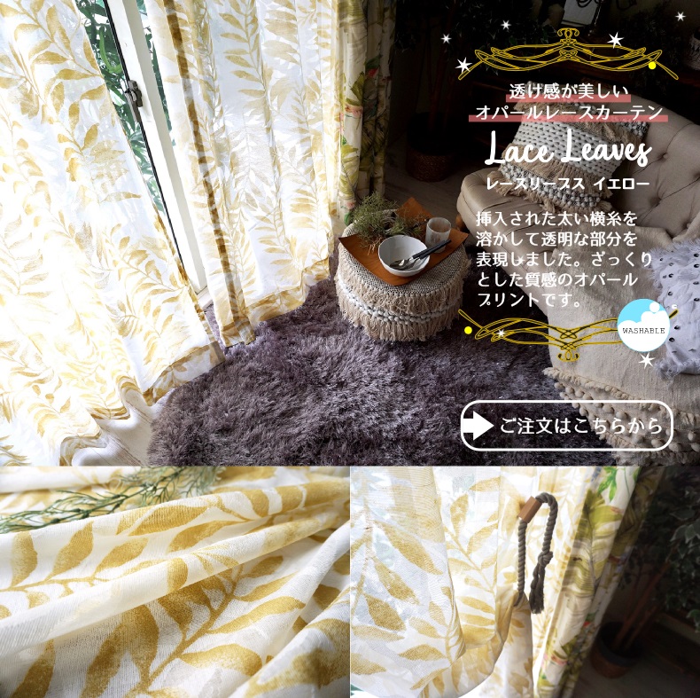 レースカーテンを替えるだけでリラックス感あふれるおしゃれなお部屋になります!しかもお求めいただきやすい価格でご準備いたしました。