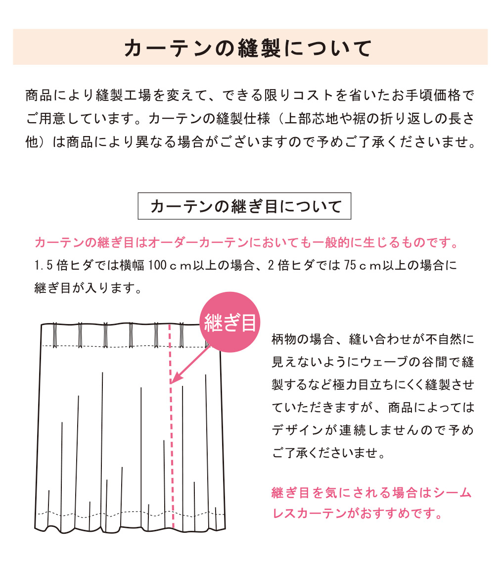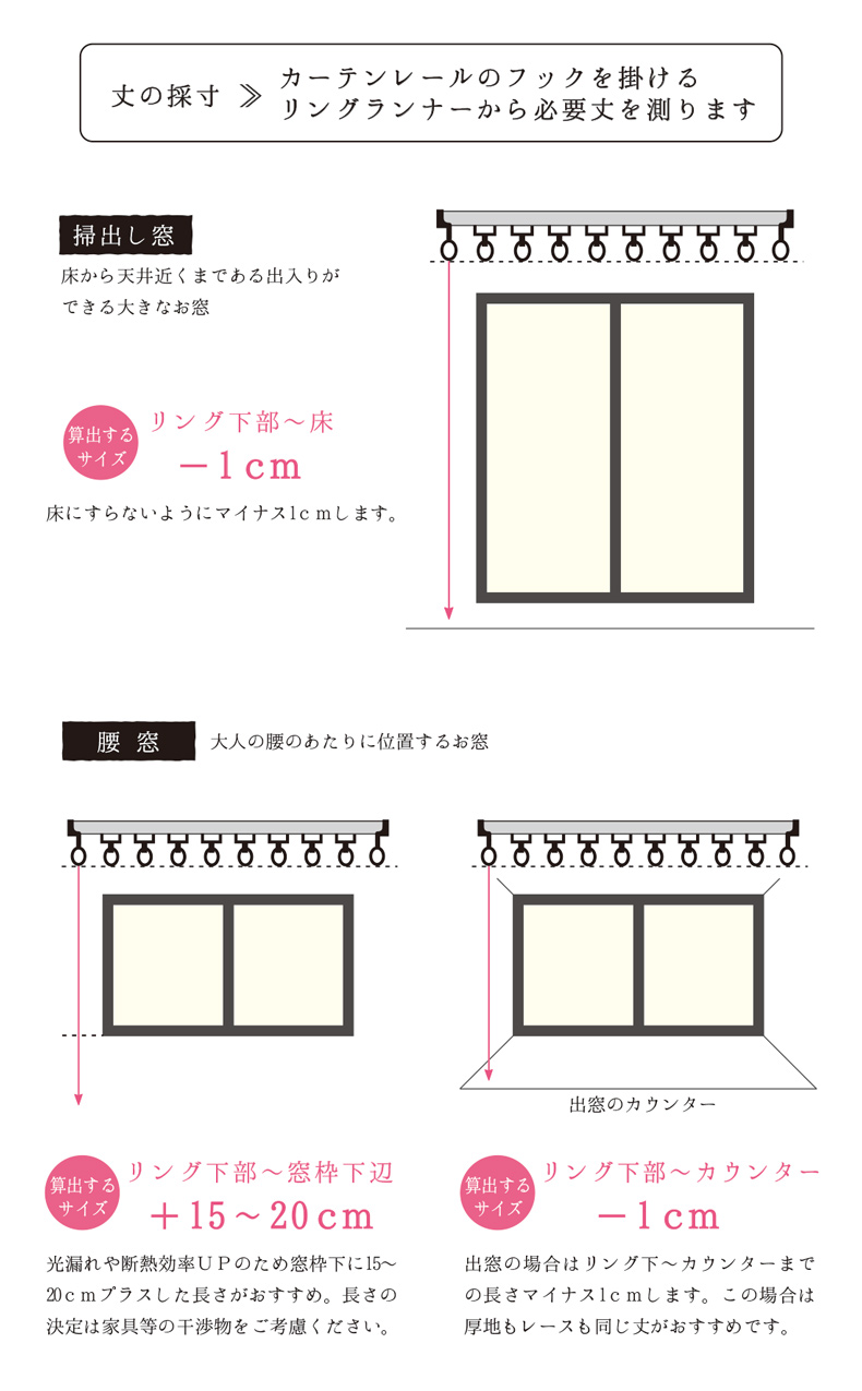 レースの丈は厚地カーテンの裾から見えないように、厚地のサイズからさらに-1~-2cmした丈がおすすめです。