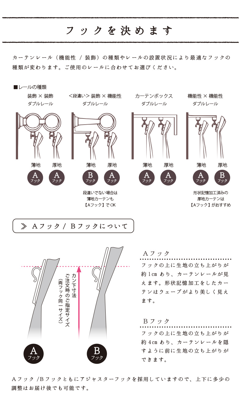 段違いになっている装飾レールの場合、厚地用のカーテンレールとレースカーテン用のカーテンレールの高さが違いますので、必ず両方のレールから必要な丈を採寸して頂きますようお願い致します。厚地は、床までの寸法-1cm、レースは床までの寸法-2cmでご注文下さいませ。
