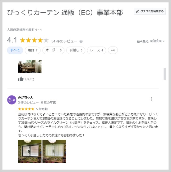 当店でお買い上げいただきました商品のご感想を【画像付き】でgoogle map のレビューにぜひご投稿下さい! 実際にお買い上げいただいたお客様からの生の声を、お聞かせいただけると幸いです。 ご応募いただきましたお客様には、もれなくプレゼントをお送りしております。 ![]() ※メールにてご投稿いただく形式の<my lovely room>も引き続きお待ちしております。 商品のお写真とご感想、ご注文者様のお名前、プレゼントの送付先を <curtain@bickly.net>のメールまでご連絡くださいませ。 →過去のご投稿<MY LOVELY ROOM> 【応募要項】 びっくりカーテンでご購入いただいた商品のご感想を画像付きでGOOGLE MAP(グーグルマップ)のクチコミにご投稿ください。 ご投稿が完了しましたら、お手数ですが<curtain@bickly.net>まで下記必要事項をメールにてご連絡くださいませ。 【必要事項】 ・お名前 ・ご注文時のご注文番号(お分かりになる場合) ・google mapにご投稿いただいたお名前(もしくはハンドルネーム) ・google mapに評価いただいた日付 ・プレゼント送付先ご住所 ・お電話番号 ※限定公開や非公開の場合、また画像がない場合(レビューの文章のみ)のご投稿はプレゼント対象外となります。 ※クチコミ投稿にはGoogleアカウントが必要です。アカウントがない場合はアカウントを作成後にご投稿をお願いいたします。 ※応募された投稿の内容や画像については、投稿者に通知することなく、当店のホームページなどに自由に転載、引用、配信など、無償での二次利用にご承諾いただいたとみなします。 ご応募いただいてから、ご投稿を確認後、2週間ほどでプレゼントを発送致します。 ※万が一、プレゼントが届かない場合は弊社までご連絡下さいませ。→0120-390-790(フリーダイヤルです) たくさんのご応募をお待ちしております! |