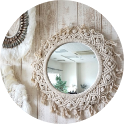 壁掛けのミラーはマクラメで装飾された ユニークなデザインから、フェザー、シェル使いまで 幅広くご用意しております。