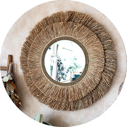 バリ島から直輸入したウォールミラーです。ボサボサとしたナチュラルな素材感がBOHOスタイルにマッチ!