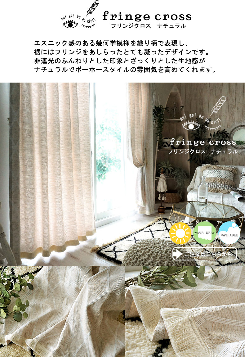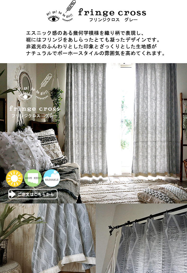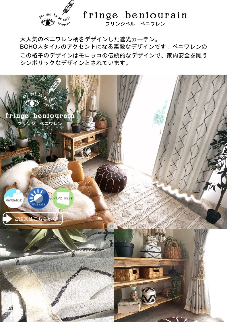 びっくりカーテンのプライベートブランド「go! go! bo ho girl!」に収録されているフリンジ付きのおしゃれな一枚。
