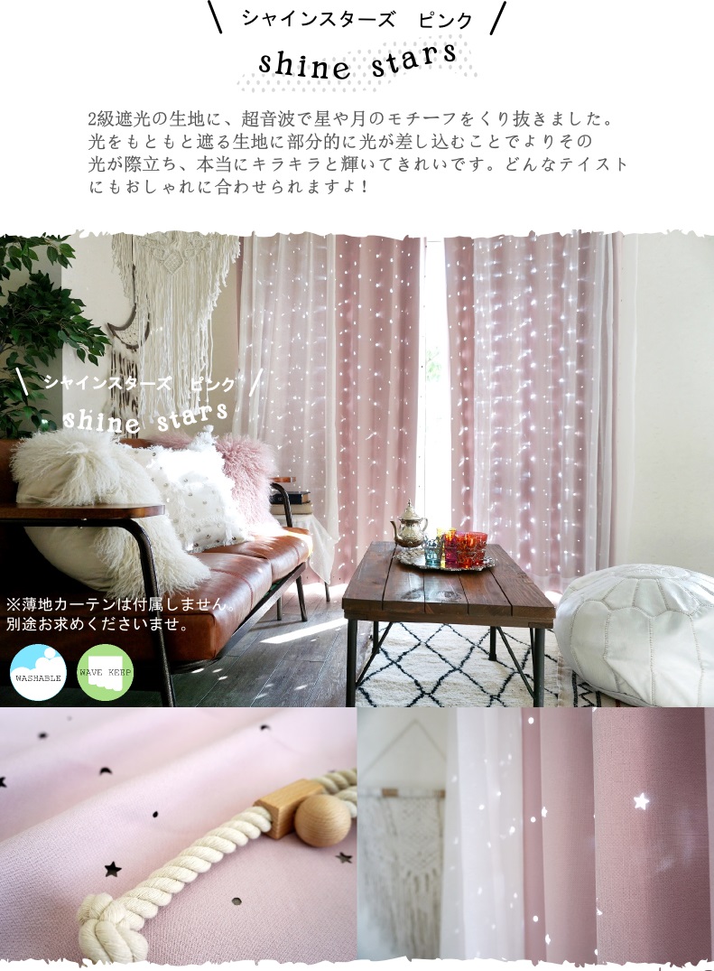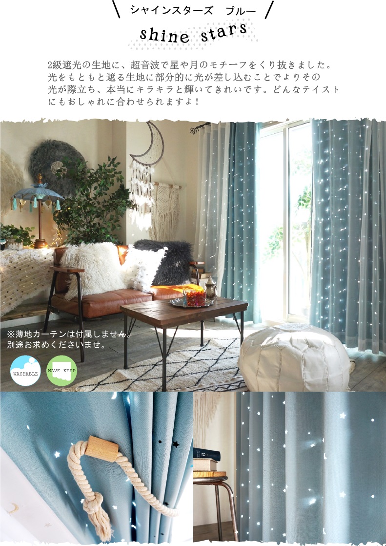 星や月のくり抜きから降り注ぐおひさまの光を感じられるカーテンや、